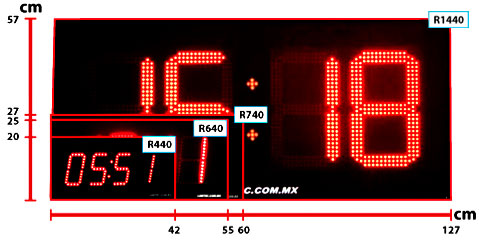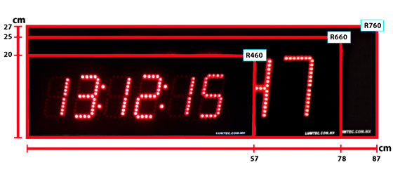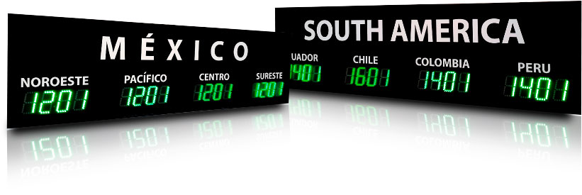 Relojes de 4 o 6 dígitos con indicadores de fecha y temperatura. También fabricamos relojes con dígitos en 15 y 25 cm, relojes en formato de 24 horas, relojes matriciales, relojes con sincronización a PC, etc.